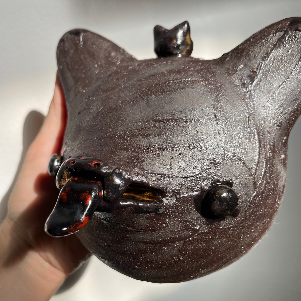 Hand-sculpted mask bisque-fired, and decorated with slips, before being fired a second time at 1220 degrees.