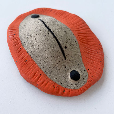 Hand-sculpted mask bisque-fired, and decorated with slips, before being fired a second time at 1220 degrees.