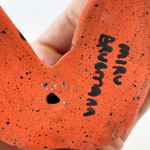 Hand-sculpted mask bisque-fired, and decorated with slips, before being fired a second time at 1220 degrees.
