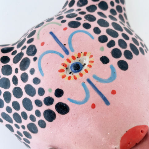 Hand-sculpted mask bisque-fired, and decorated with slips, before being fired a second time at 1220 degrees.