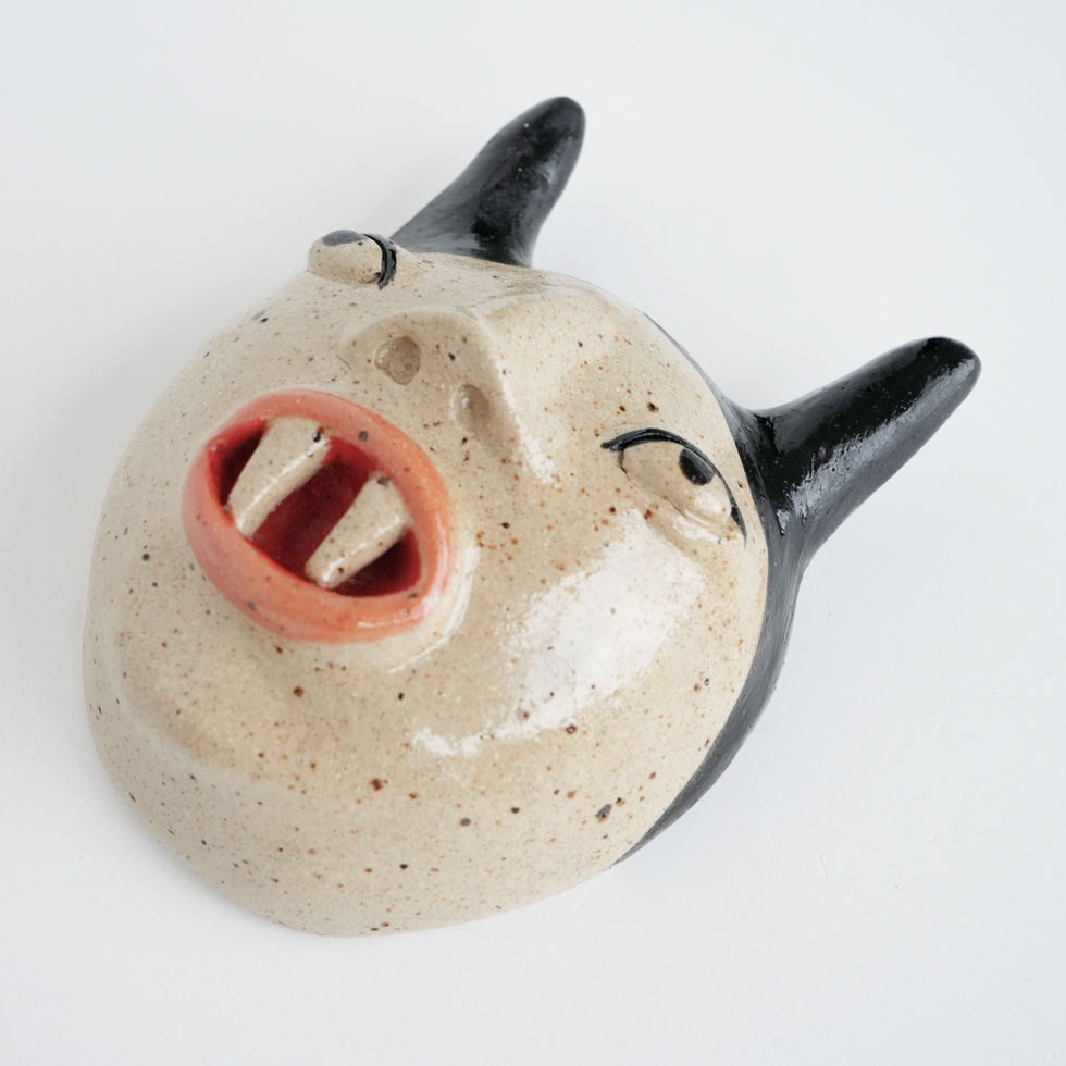 This mask is hand-sculpted from white clay, bisque-fired, and decorated with slips, before being fired a second time at 1220 degrees, for a clear glaze finish.